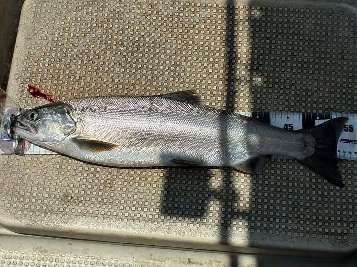 風予報のため南エリアで、一気に南下し南風に押されながらトローリング、相変わらずチビマスが多いですが、55㎝を頭にポツポツ釣れてくれ、何とか出荷できました
